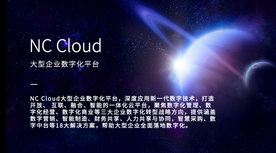 NC Cloud大型企业数字化平台,深度应用新一代数字技术,打造开放、 互联、融合、智能的一体化云平台,聚焦数字化管理、数字化经营、数字化商业等三大企业数字化转型战略方向,提供涵盖数字营销、智能制造、财务共享、人力共享与协同,智慧采购、数字中台等18大解决方案,帮助大型企业全面落地数字化。