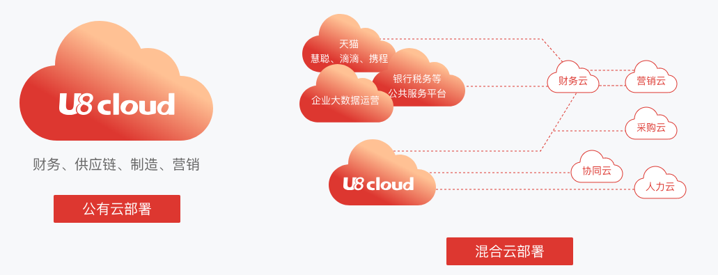 混合云部署:云应用部署在云端,企业ERP部署在企业内部,相互独立,但在云的内部又相互连通,可以发挥出各自的优势