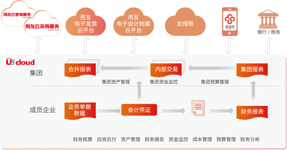 U8 cloud财务管理应用,满足智能财务新模式,通过用友云与客户、供应商、服务商等产业链伙伴进行实时交易和财务信息共享与传递,使多组织企业的智能化财务核算、财务管理与财务分析更高效