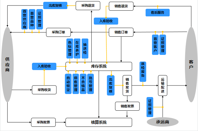 4)有效期至管理、资质效期管理、经营范围管理、黑名单管理、质量状态、首营审批、预警功、特殊药品双人验收复核、特殊药品禁止现金交易、特殊药品回执管理;