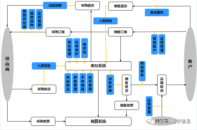 4、通过技术手段结合WMS智能仓储管理系统,以供应链为核心,实现了资质管理、药品采购、收货与 验收、储存与养护、药品销售、配送与运输全过程的经营质量管理。