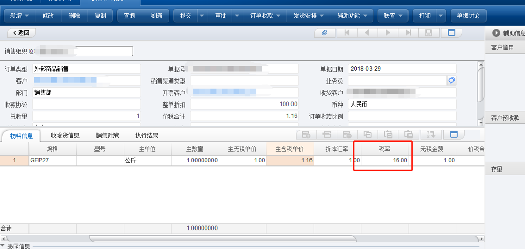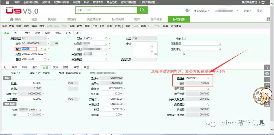 新增SO,,选择上面修改的客户,查看销项税税率变化,在“交易”页签可查看到税率变为了16%。