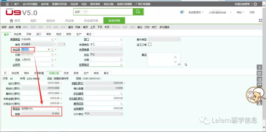 新增PO,可以看到税率变为了16%,在“交易价格”页签可以看到税率会跟着供应商变化。