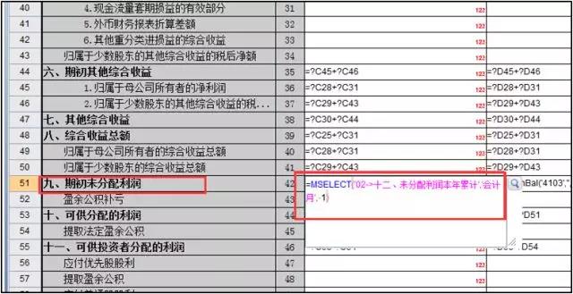 还有一些单元格要取上个会计期间经过加工的数据,无法直接用公式从总账取数,此情况下可以先设置一个跨表取值公式,从原表样对应数据上把数据取过来。数据计算完确认无误后,再将其改成最终要用的公式。如下图,先用MSELECT取原表样上的期末累计利润,之后再改回取本表的上期累计利润。